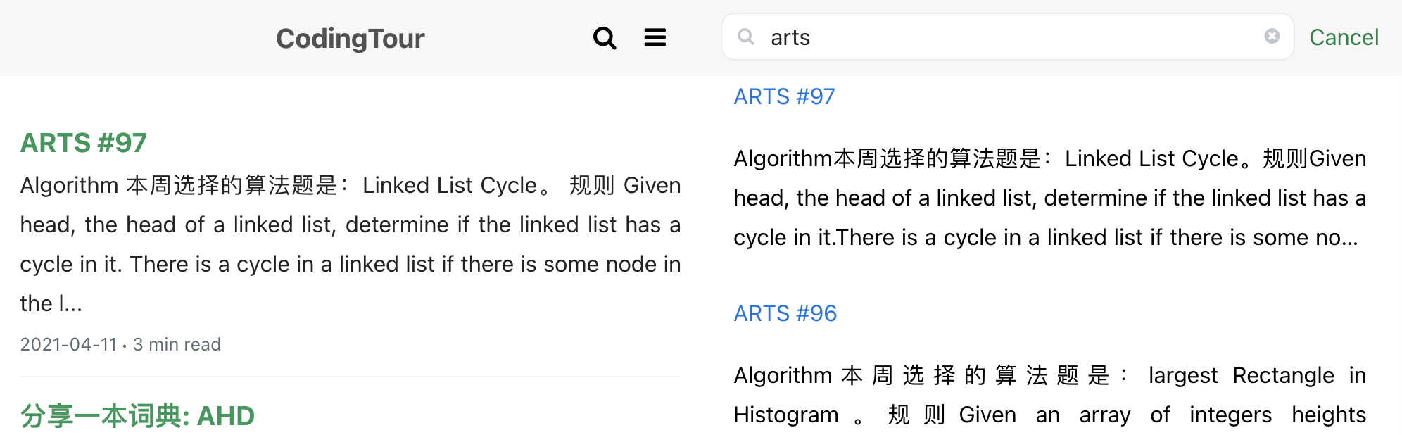 相比 Simple-Jekyll-Search 提供的默认功能,我做了两处更新: