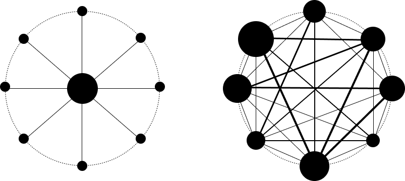 图中每个圆球代表一个团队成员,圆球的大小代表该团队成员同其他团队成员的协作总量,圆球越大,表示该团队成员在团队中越活跃,同其他团队成员的协同性越好;每两个圆球之间有一个连接线条,线条的粗细代表两个团队成员之间的协作紧密度,线条越粗,表示两个团队成员协作越密切。