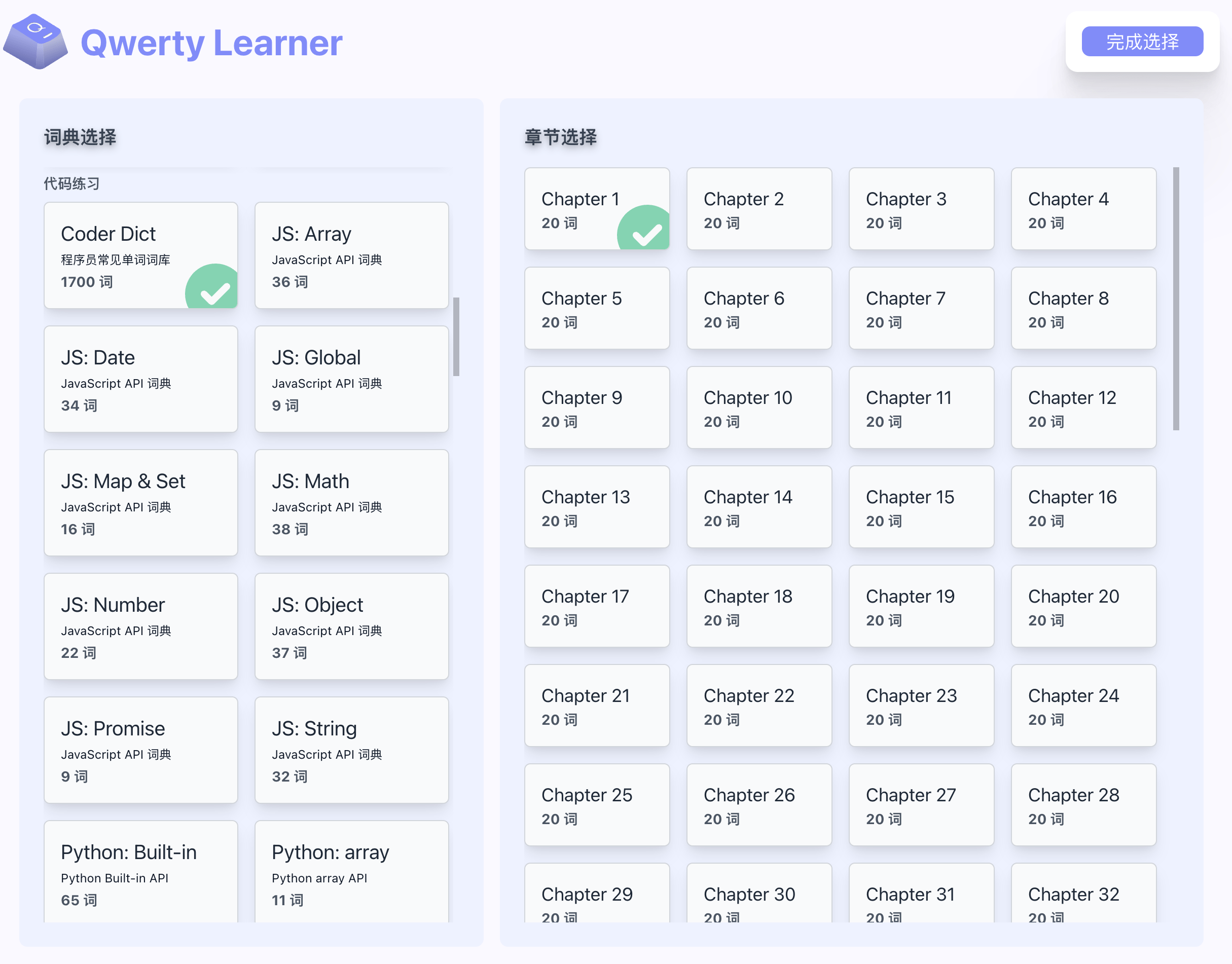 一个适合训练单词拼写的工具:Qwerty Learner,除了常见的 4/6 级、托福、雅思等词库,还内置了编程词库: