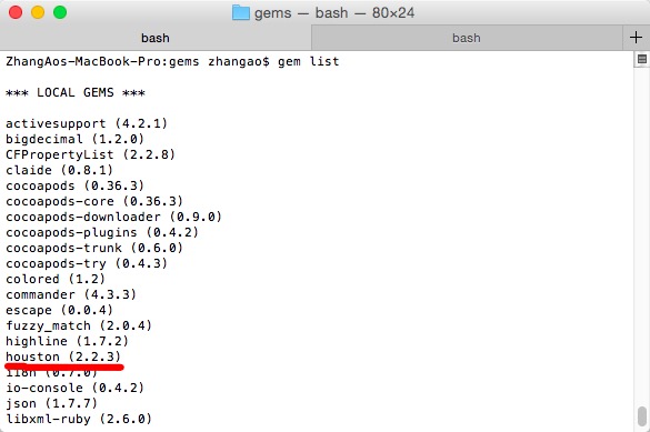 安装成功后执行gem list命令可以看到 houston 和它的版本号:
