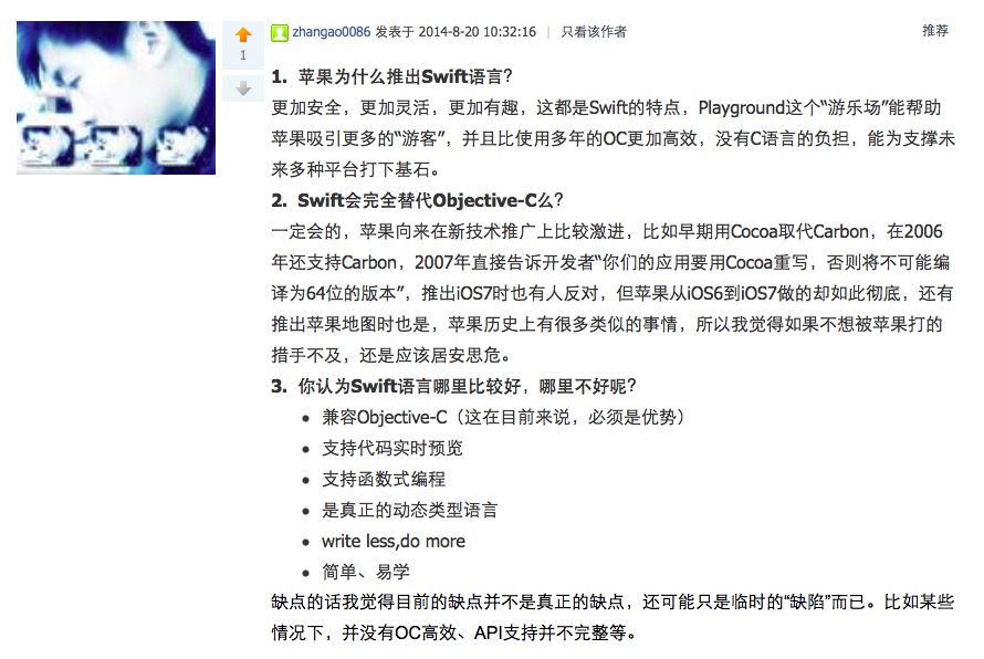 对目前的 Swift 来说,我是坚定的反对者,这种立场其实和我最开始时不一样:  Swift 目前非常不稳定,连 Xcode 都对它兼容的不好,每次 Swift 有个稍大的更新就像是把项目推倒重来,而且也不可能完全只用 Swift 来开发一个项目,基于 Objective-C 和 C 的框架有很多,iOS 是开发离不开 C 的。 除此之外,我觉得 OC 比 Swift 更加灵活,前者更依赖运行时,后者几乎就是编译时,OC 能做很多 Swift 做不了的事情,如运行时的关联对象等,不过这并不是说 Swift 不重要,只是一定要排一个优先级的话,我觉得短期内 Swift 无法对 Objective-C 造成太大影响,所以先学好 OC 还是更好一些,而且技多不压身嘛