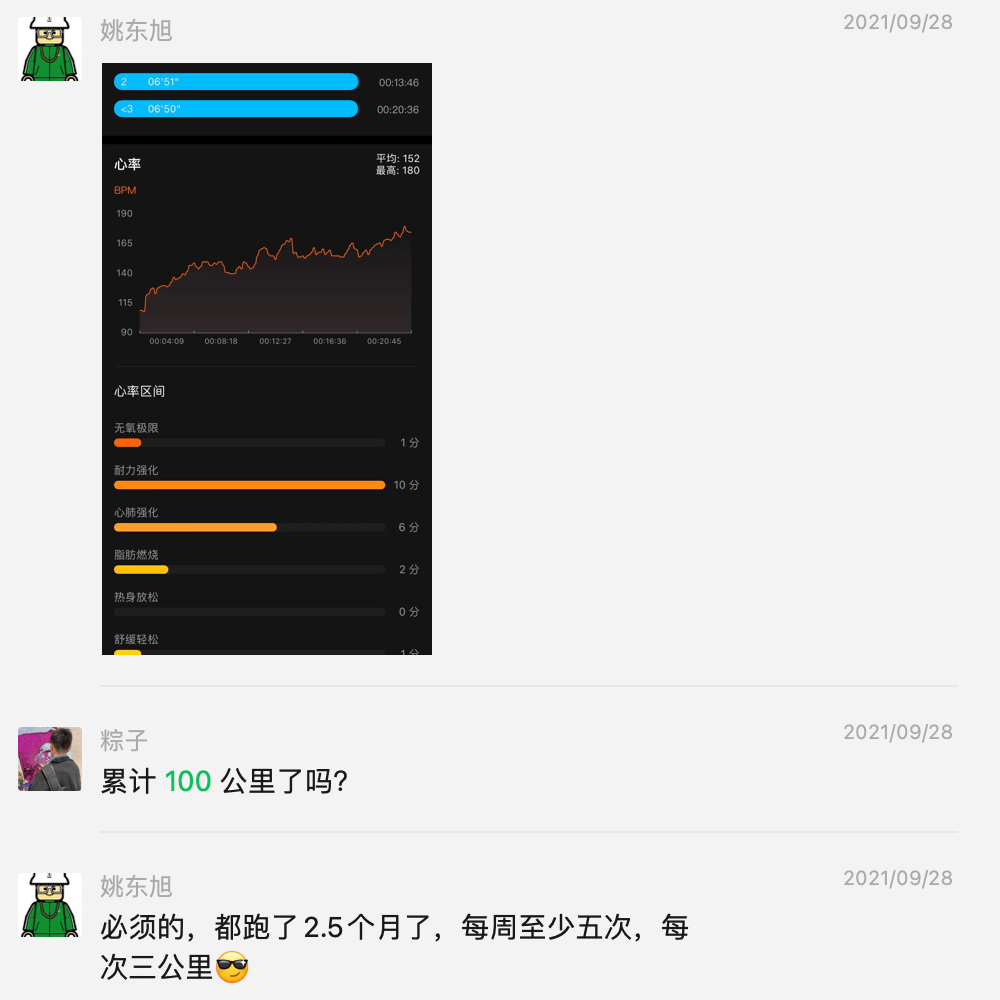 从国庆节开始跑步,到年底12月31号累计跑了 106.88 公里🎉跑步开始的初衷是看到群里这样一段对话: