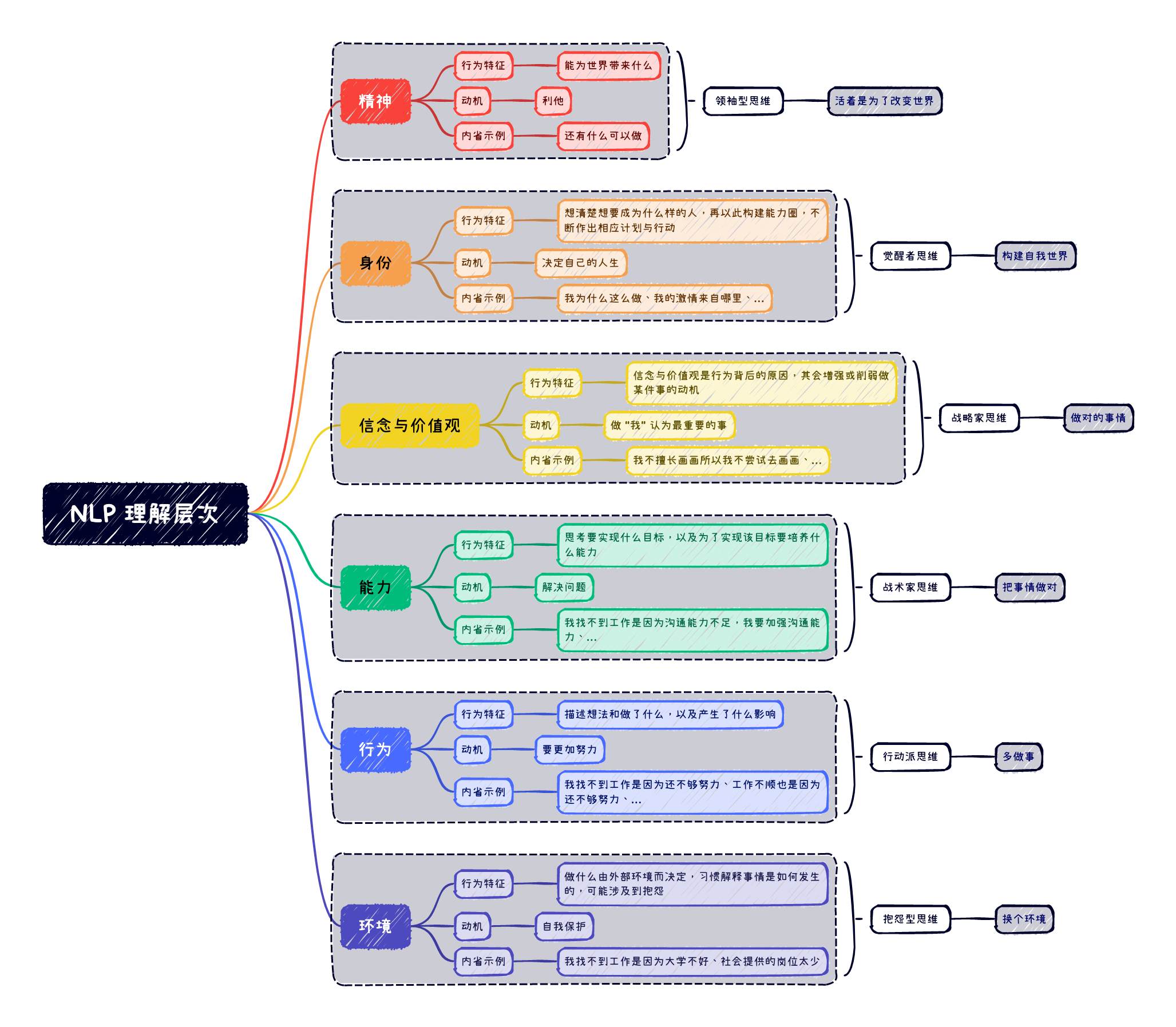 NLP 理解层次共有六层,高维度会直接影响低维度的行为,反之则不行。比如我们拥有的资源、时间、空间等,本质上都属于环境范畴,对环境以上维度的人来说,环境只是我们可以调动的资源而已,为了实现高维度的目标,无论是调动周边资源,还是主动提高自身的能力,都只是实现目标的手段罢了。想想毛主席创业之初,没有资源、没有人才、没有固定资产、没有流动资产,什么都没有,偏偏成就了伟大的事业,挺值得研究。
