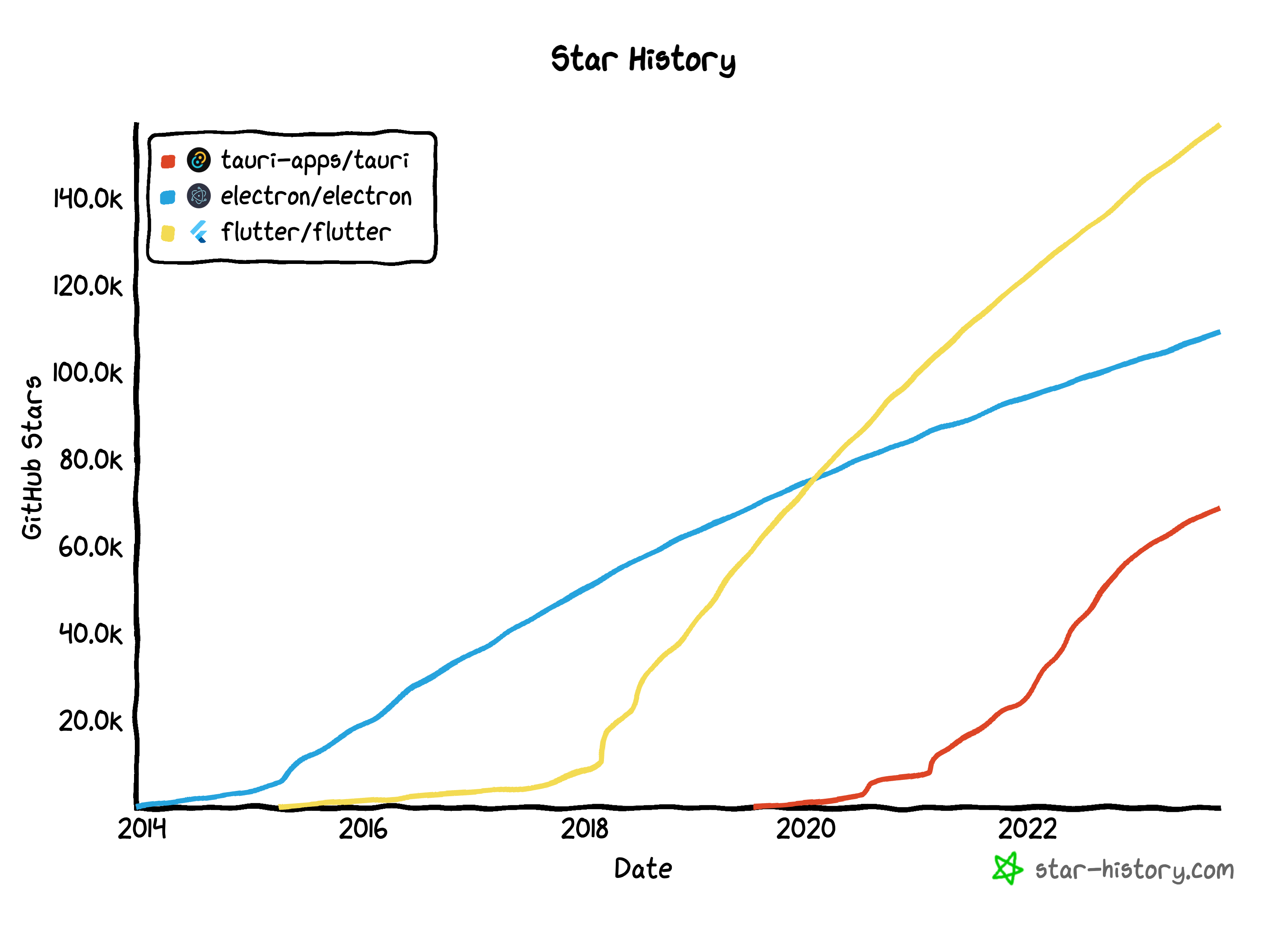 自 2022 年 6 月发布 Tauri 1.0 以来,一年时间也才将将发展成 2.0,在跨端市场里是一个新玩家,不过近两年受到了开发者的喜爱,Star 数直逼 Electron: