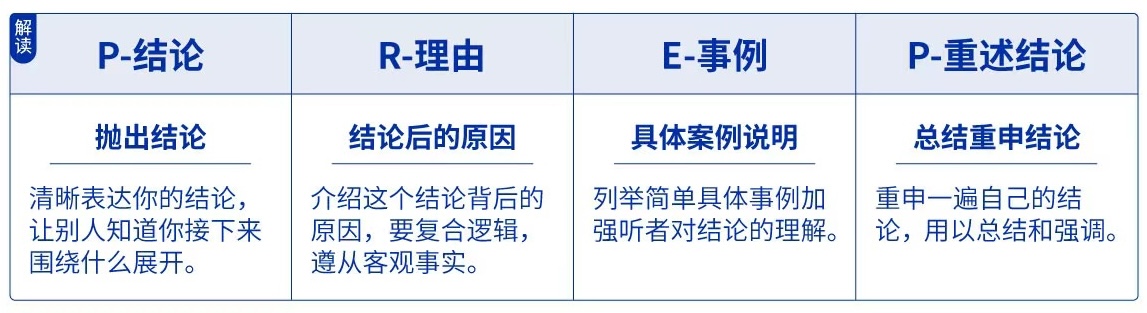 汇报工作不是罗列任务清单,而是要突出结果。PREP 表达模型就是来干这个的,P 代表结论先行,上来就给出结论,直击重点,抓住注意力;R 代表理由,陈述原因,要符合逻辑,尊重客观事实;E 代表例证,通过给出有说服力的事实依据,加强听者对结论的理解;P 代表重述结论,将发散的思维回归结论,强化观点。