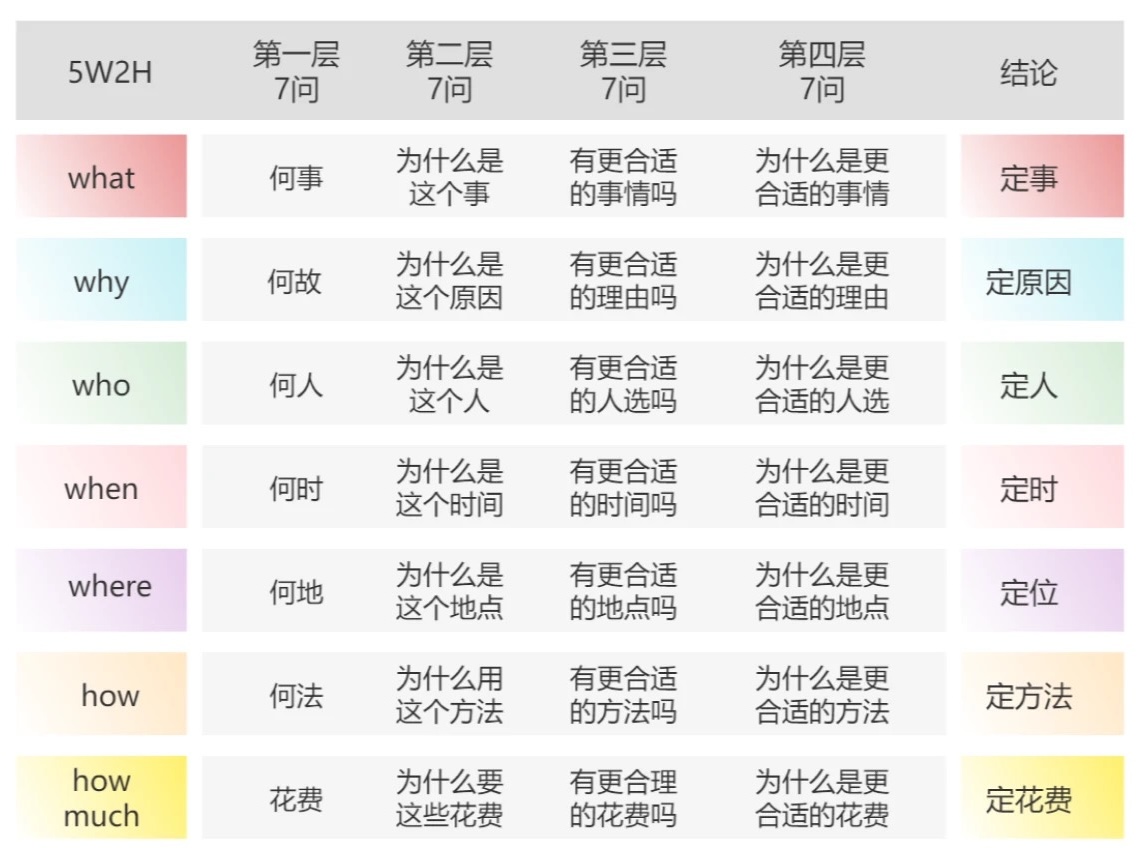 跟团队分享经验时,一定要进行多维度的分析,不可泛泛而谈。可以使用 5W2H 分析法从 7 个维度思考,以产品分析为例,对应产品背景、目标人群、预期目标、使用场景、需求节点、如何验证以及用多少资源(ROI),这样不仅易于他人理解,也具有很强的启发意义。
