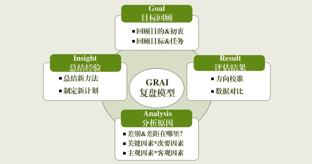 结束一个项目时,复盘总结非常重要。可以使用 GRAI 复盘法来进行工作复盘,G 代表回顾目标;R 代表评估结果,进行方向校准和数据验证;A 代表分析成功/失败原因,包括表层和深层原因,以及偶发性和必然性;I 代表总结规律方法论。复盘的本质是将做过的事情,再从头过一遍,检验 + 校正目标,分析过程中的得失,便于改进,不断总结经验、形成方法论。