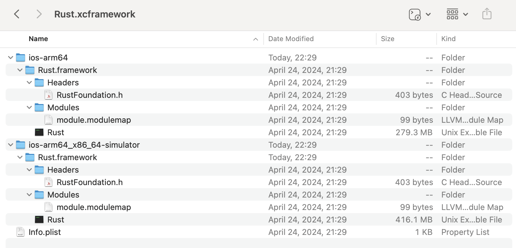 由于是手动构建 xcframework,里面的 Info.plist 和 module.modulemap 两个文件提前写好,然后构建的时候复制过去即可,我是把它们放在 ios-ingredient 目录下,文件内容可以参考: