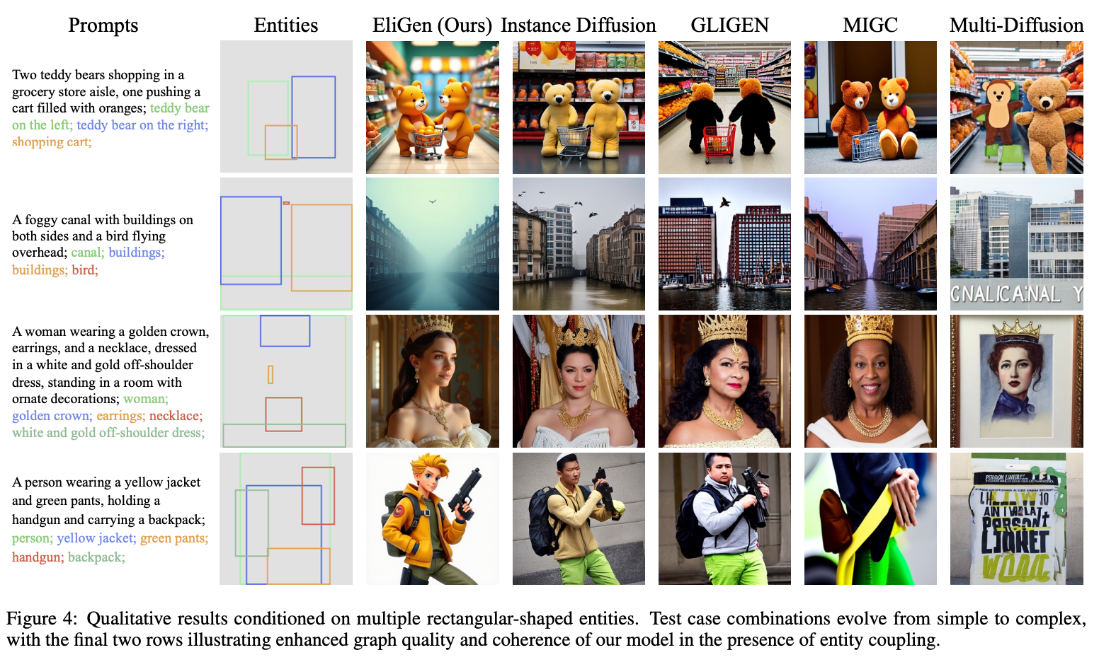 现有的文生图像模型(Stable Diffusion、DiT)虽能生成高质量图像,但仅依赖全局文本提示难以实现实体级别的精细控制(如修改单个物体的形状、位置或属性)。EliGen 旨在通过引入区域注意力机制和多模态实体条件解决这一限制,实现更灵活、精确的图像生成与编辑。