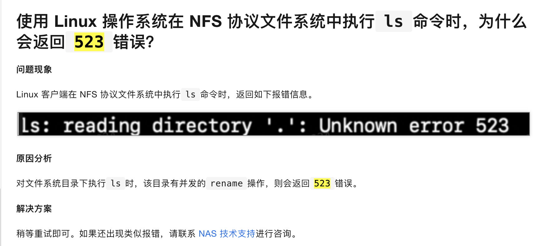 在阿里云 NAS 上操作还是要小心一点,如果有大量的 rename 操作会导致 ls 执行失败,从而导致依赖 ls 结果返回的后续操作都无法进行。