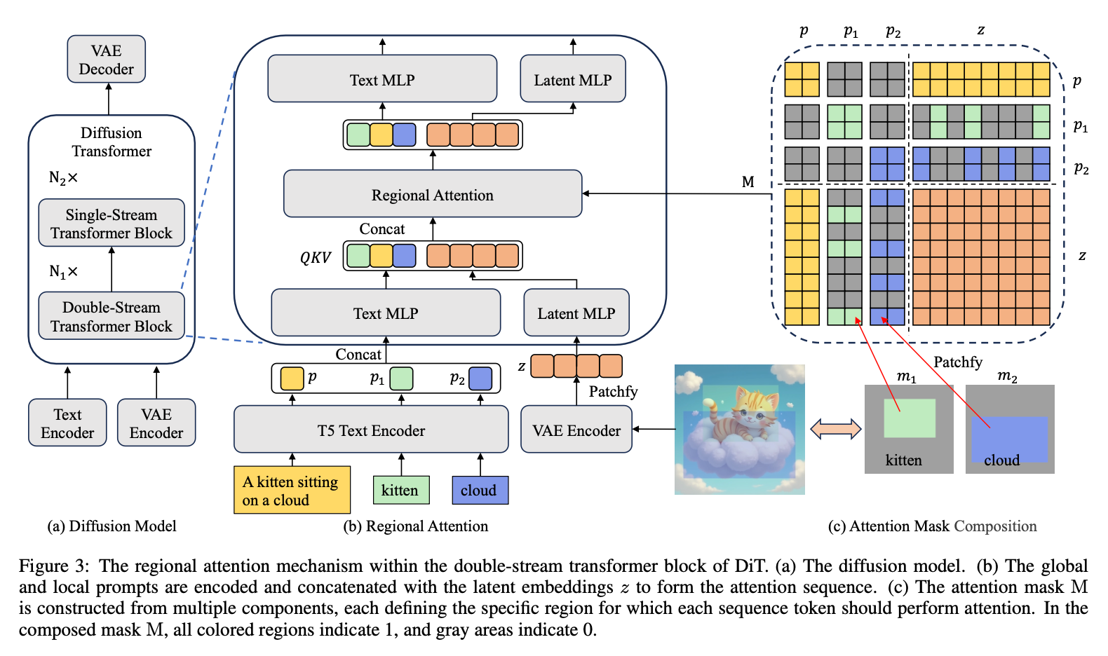 Regional Attention 是 EliGen 提出的改进机制,在保持 Cross-Attention 全局对齐能力的同时,引入了空间掩码约束,实现实体级别的细粒度控制,它无需额外的参数,直接改造了扩散模型的注意力模块,能在单次生成中同时控制多个实体的位置、形状和属性,比如 “左侧红色汽车+右侧戴帽子的人”,这样就提高了单次前向传播中的全局 & 局部一致性: