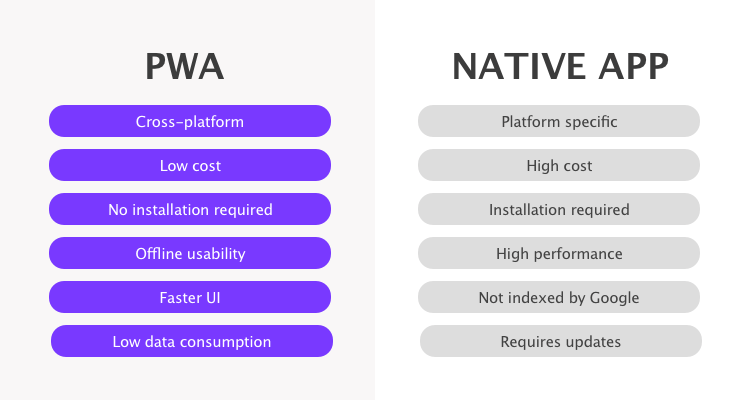 - 不需要下载 - 用户可以通过 URL 访问 Web App 直接使用服务,不用等待下载,而且 Native App 不能被 Google 等搜索引擎索引,开发者仍然需要制作一个 Web 页面以进行 SEO
