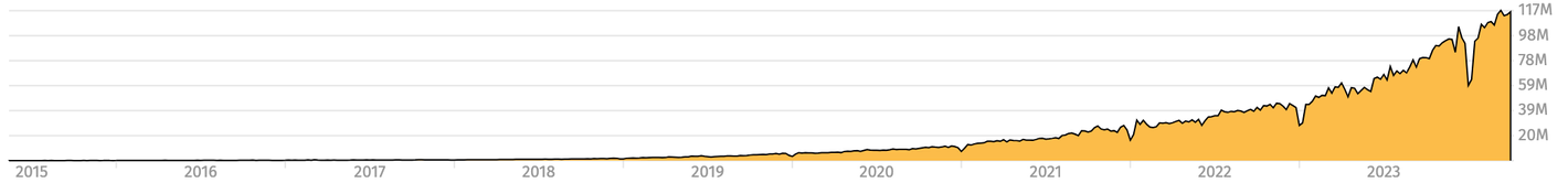 crates.io 目前单天下载量在 1.44 亿,超过了自 2015 年 5 月发布 Rust 1.0 以来到 2022 年的总下载量,其生态从 2020 年起,每年下载量以 1.7 倍速度增长。