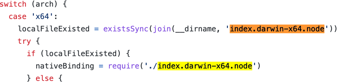.node 文件的原理,虽然它的后缀是 .node,但实际上是原生平台的构建产物,比如在 macOS 上是 Mach-O: