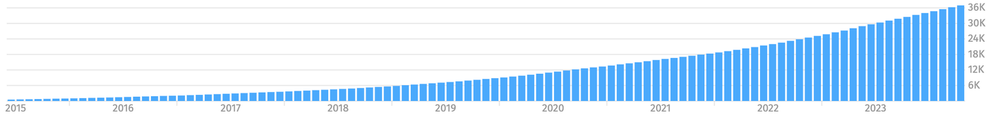 目前有 37000 左右的 用户/团队 将他们的 crate 发布在公网上,每年增长率为 1.3 倍左右。