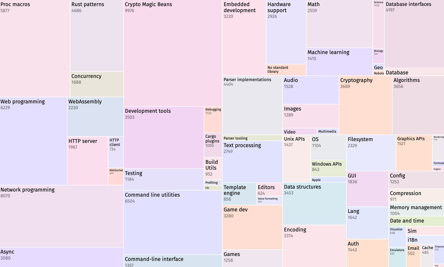 根据 Lib.rs 的统计,目前 Crates 数量约为 14 万。作为对比,服务于 Swift 和 Objective-C 的 iOS 依赖管理软件,CocoaPods,目前的 Pods 数量约为 10 万。