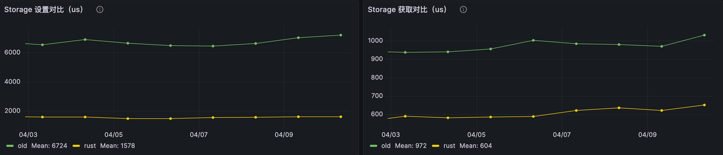 本来我们的存储组件性能监控是以 ms 为单位,但在对比原生平台性能时,0 和 1 之间的实际差异看不出来,故改为了 us。