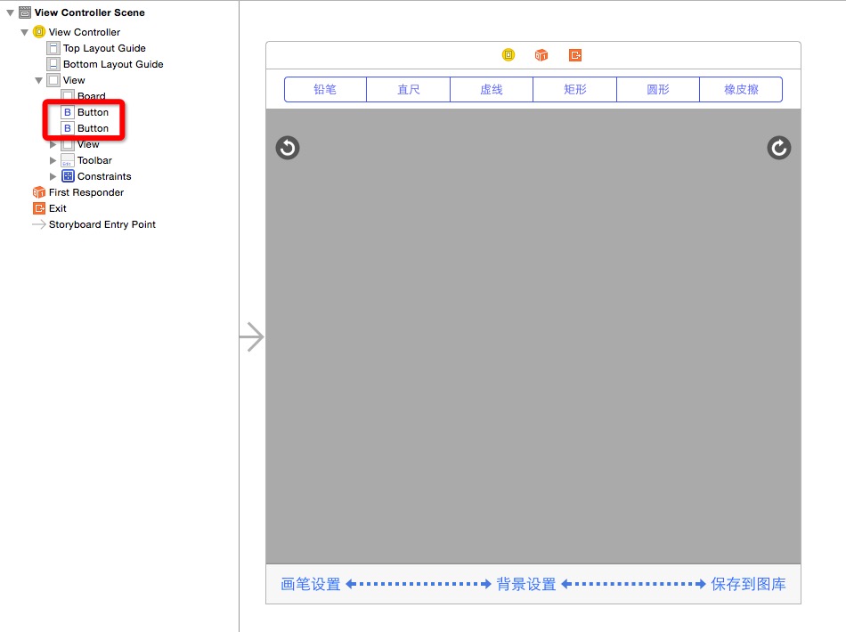 (此时的 Board 还没有 undo/redo 方法,你可以自行添加或者稍后再添加) 两个按钮本身也连接到 VC 里: